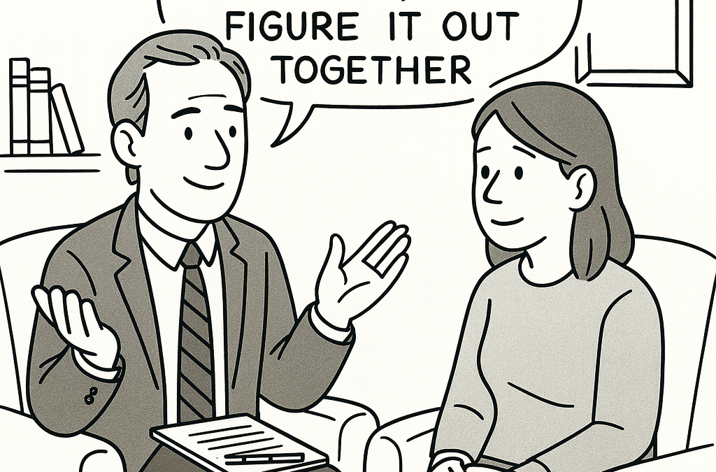 “I don’t know yet,” followed by “but here’s how we’ll figure it out,” creates a different kind of therapeutic relationship; one built on genuine partnership, not expert authority.